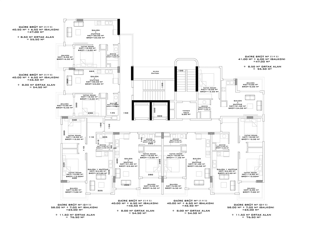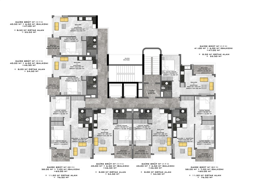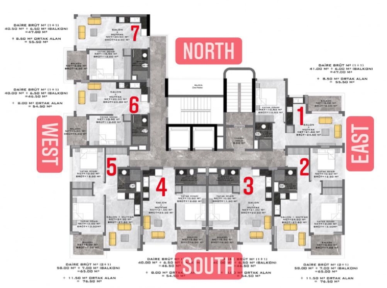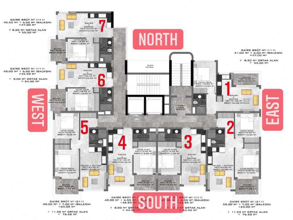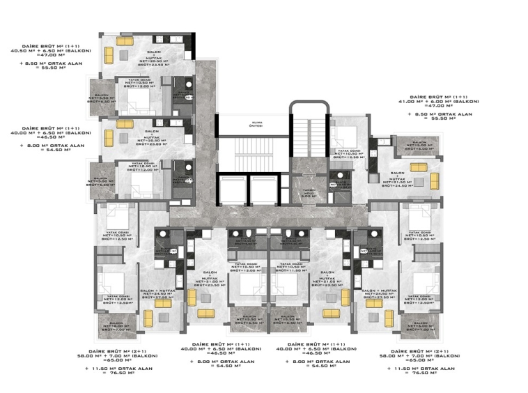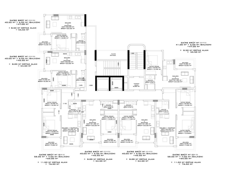 THE VOYAGE RESİDENCE складається з 1 житлового будинку, 7 поверхів із загальною чисельністю 49 квартир. На вибір є квартири 1+1 квартири 54,5-55,5 кв.м. і 2+1-76,5 кв.м, пентхауси 2+1-110 кв.м та 3+1 по 150 кв.м.